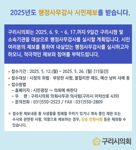 구리시의회(의장 신동화)는 실질적이고 시민에게 체감되는 행정사무감사를 위해 5월 12일부터 5월 26일까지 15일간 시민 제보를 받는다.