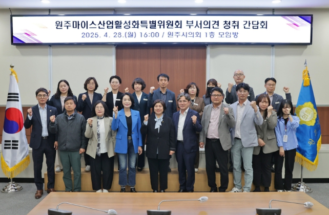 원주시의회 원주마이스산업활성화특별위원회는 4월 28일 원주시의회 1층 모임방에서 원주마이스산업활성화특별위원회 부서의견 청취 간담회를 개최했다.