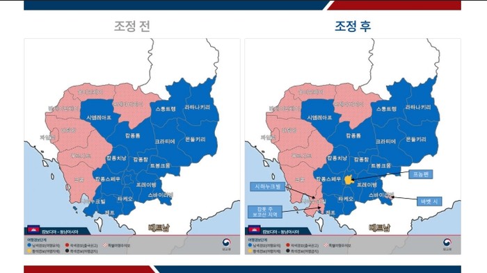 이번 여행경보 상향은 우리 국민의 취업사기·감금 피해가 주로 발생해온 수도 프놈펜 및 시하누크빌州, 그리고 최근 동 피해가 크게 늘어난 캄폿州 보코산 지역과 캄보디아-베트남 국경 지역에 위치한 바벳市가 대상으로, △프놈펜市에는 2단계(여행 자제) △시하누크빌州, 캄폿州 보코산 지역, 바벳 市에는 특별여행주의보를 각각 발령한다.