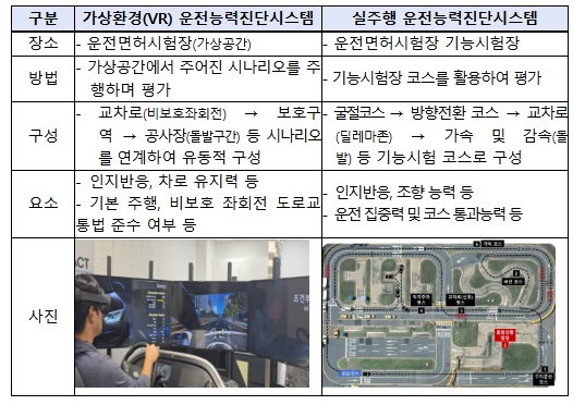 경찰청과 한국도로교통공단(이사장 김희중)은 11월 5일 오후 2시 서울 강서운전면허시험장에서 보건복지부, 국립중앙의료원 중앙치매센터, 손해보험협회 등이 참여한 가운데 실주행 및 가상환경 기반 운전능력진단시스템 시연회를 개최했다.