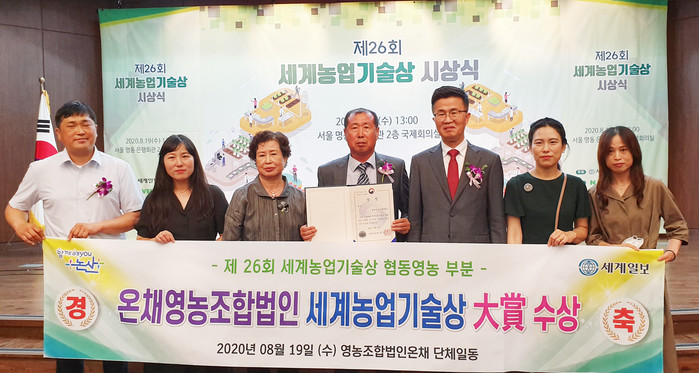 충남 논산시농업기술센터(소장 장익희)는 19일 서울 은행회관 국제회의실에서 개최된 ‘제26회 세계농업기술상’에서 온채영농조합법인이 협동영농부분 대상을 수상했다고 전했다.
