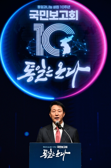 ▲ 오세훈 서울시장이 26일(월) 열린 ‘(재)통일과나눔 설립 10주년 국민보고회’에서 축사를 하고 있다. |