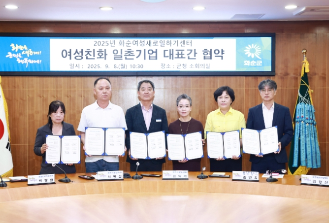 화순군은 8일 군청 소회의실에서 화순여성새로일하기센터와 관내 5개 기업 대표 및 임직원이 참석한 가운데 2025년 여성친화 일촌기업 협약식을 체결했다고 밝혔다.