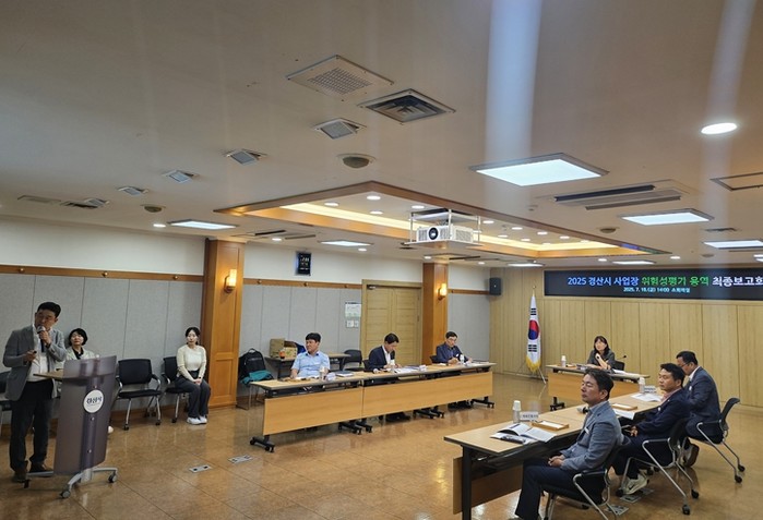 경산시는 18일 소회의실에서 '2025 경산시 사업장 위험성평가 용역' 최종보고회를 개최했다. 이날 보고회에는 부시장을 비롯해 건설안전국장, 안전총괄과장, 회계과장, 체육진흥과장, 농정유통과장, 환경시설사업소장 등 10여 명의 관계부서장이 참석해 용역 추진 경과와 주요 결과를 공유했다.