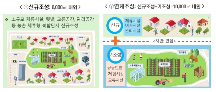 ‘농촌 체류형 복합단지 조성 시범사업’은 20호 내외의 소규모 주거시설과 편의공간 등 관리시설, 영농체험을 위한 텃밭, 휴식과 여가를 즐길 수 있도록 지역의 관광·문화자원 등과 연계한 교류 프로그램을 복합 제공하는 사업이다.