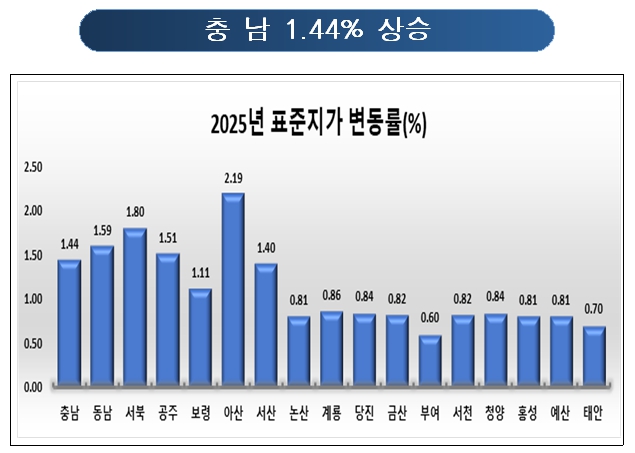 충남 변동률은 지난해 0.85%에서 올해 1.44%로 상승했는데 천안·아산지역 등 각종 개발사업 증가가 토지 가치 상승을 견인한 것으로 분석된다.