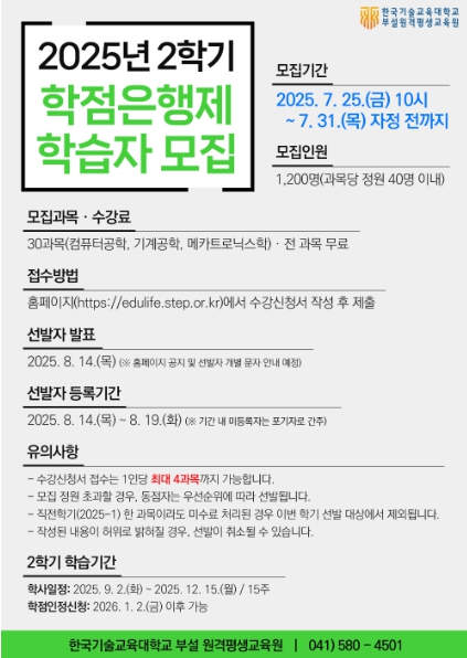 ▲ 한국기술교육대학교 부설 원격평생교육원 2025년 2학기 학점은행제 학습자 모집 공고 |