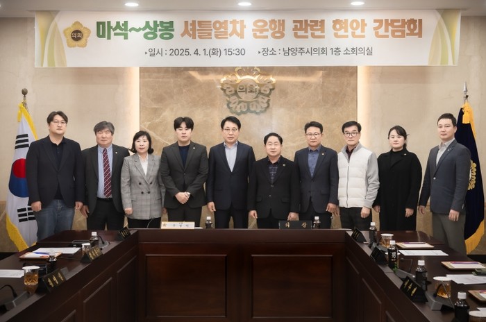 이날 간담회는 마석-상봉 셔틀열차 개통 추진 상황을 점검하고, 5월 정상 개통을 위한 의회와 집행부 간 협력방안에 대해 논의하고자 마련됐으며, 조성대 남양주시의회 의장과 박경원 도시교통위원장, 김지훈(민) 부위원장, 이상기 의원, 김지훈(국) 의원, 김영실 의원, 이진환 의원, 이수련 의원, 김상수 의원을 비롯해 주광덕 남양주시장과 관계 공무원들이 참석했다.