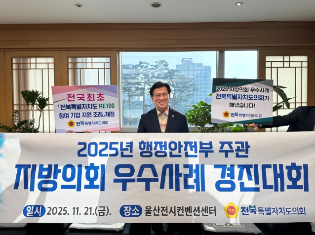 전북특별자치도의회가 지난 21일 울산전시컨벤션센터에서 열린 행정안전부 주관 ‘2025년 지방의회 우수사례 경진대회’에서 본선에 진출해 수상하는 영예를 안았다.
