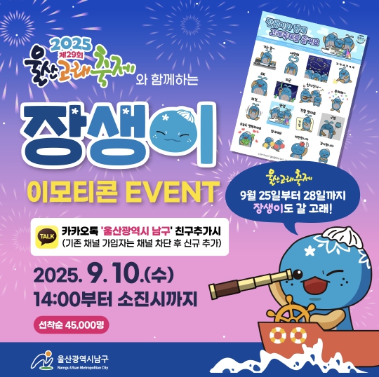 울산 남구는 제29회 울산고래축제를 맞아 남구 관광홍보대사 ‘장생이’ 이모티콘을 무료로 배포하는 이벤트를 진행한다고 밝혔다.