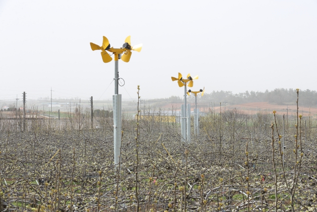 방상팬은 철제 파이프 위에 설치된 전동 모터에 날개를 부착, 온도가 내려갈 때 모터를 가동해 송풍하는 장치이다. 미세살수장치는 기온이 영하일 때 스프링클러로 물을 뿌려 얼음으로 변할 때 나오는 잠열을 이용해 꽃눈과 꽃을 보호할 수 있다. 통로형 온풍 시설은 과수원 중앙에 온풍기를 설치하고 따뜻한 바람을 내보내는 통로를 나무가 심어진 줄에 배치, 과수원 내부 온도를 2∼3도 올리는 장치이다.
