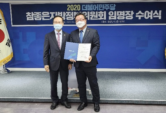 | ▲ 홍종원 대전시의회 행자위원장(우측)이 더불어민주당 참좋은지방정부위원회 상임위원으로 임명받고 있다. |