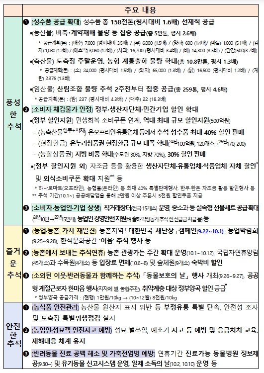 농림축산식품부는 풍성한 추석, 즐거운 추석, 안전한 추석을 주요 골자로 하는 '농업·농촌분야 추석 민생안정대책'을 마련했다고 발표했다.