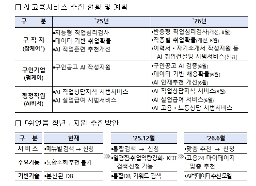 국가일자리정보플랫폼에 기반한 맞춤형 고용서비스도 대폭 확대해 나갈 방침이다. ’26년에는 구직자 대상 이력서·자기소개서에 대한 인공지능(AI) 취업컨설팅, 구인기업 대상 채용 확률에 기반한 맞춤 구인 컨설팅을 신규 개발·제공한다.