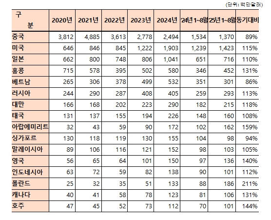▲ 화장품류 국가별 수출 현황(2025년 8월 기준, 1억 달러 이상 수출국가) |