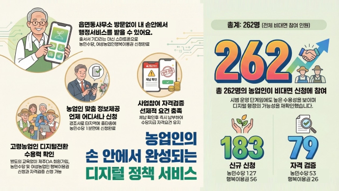 제주특별자치도 농업기술원이 공공 마이데이터를 활용한 농업 정책수당 비대면 신청·검증 서비스를 시범 운영한 결과, 4.76점의 높은 만족도를 기록하며 농업 행정의 디지털 전환 가능성을 입증했다.