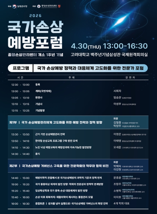 질병관리청은 중앙손상관리센터 개소 1주년을 맞아 4월 30일 고려대학교 백주년기념삼성관에서 「2026년 국가손상예방포럼」을 개최한다.