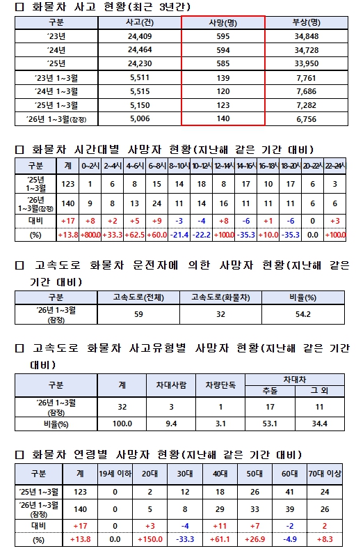 경찰청 교통사고 통계에 따르면 2026년 3월까지 발생한 화물차 사망사고(잠정)는 최근 3년 같은 기간 평균(1~3월) 발생한 사망자인 127.3명보다 9.9% 증가한 수준인 140명이 발생했다.