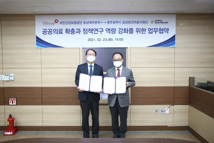 [광주=프레스뉴스] 강래성 기자= 국민건강보험공단 호남제주지역본부(본부장 안수민)와 광주광역시 공공보건의료지원단(단장 권순석)이 23일 호남제주본부 사옥 3층 회의실에서 공공의료 체계 강화, 지역민 건강형평성 향상, 합리적 의료전달체계 확립을 위해 “공공의료 확충과 정책연구 역량 강화 업무협약(MOU)”을 체결했다.