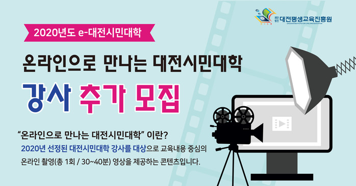 (재)대전평생교육진흥원(원장 금홍섭)은‘온라인으로 만나는 대전시민대학’의 교육 콘텐츠 제작을 위한 강사를 오는 18일까지 추가 모집한다고 8일 밝혔다.