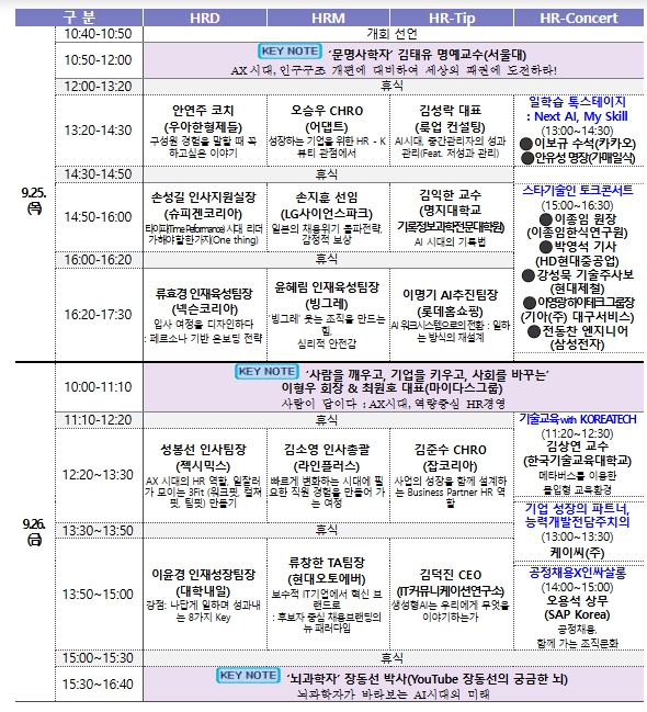 둘째 날인 9월 26일에는 마이다스그룹 이형우 회장과 최원호 대표가 ‘사람이 답이다: 인공지능 전환(AX) 시대, 역량 중심 인적자원(HR) 경영’이라는 주제로 인공지능이 대체할 수 없는 요소인 역량을 중심으로 성과를 만드는 성과역량을 소개하고, 과학 커뮤니케이터 장동선 박사가 ‘뇌과학자가 바라보는 인공지능(AI) 시대의 미래’라는 주제로 강연할 예정이다.