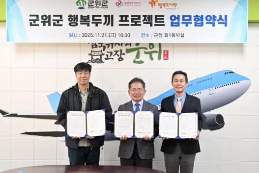 군위군은 21일 행복나래 주식회사, 행복도시락사회적협동조합과 함께 '군위군 행복두끼 프로젝트' 업무협약을 체결했다. 이날 협약식에는 김진열 군수를 비롯해 행복나래(주) 조민영 본부장, 행복도시락사회적협동조합 최준 사무국장이 참석했다.