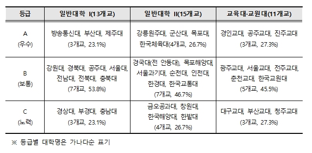 국립대(37개교) 및 국립대법인(2개교) 총 39개교를 전임교원 수에 따라 일반대 Ⅰ(13개교), 일반대 Ⅱ(15개교), 교육대·교원대(11개교)로 분류하여 점검을 실시했으며, 주요 결과는 다음과 같다.