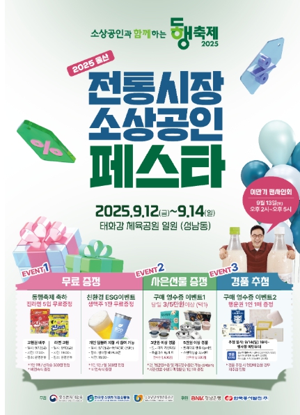 중소벤처기업부는 9월 동행축제를 맞아 울산 성남동 태화강 체육공원에서 9월 12일부터 14일까지 대규모 지역 행사 ‘울산 전통시장‧소상공인 페스타’를 개최한다고 밝혔다.