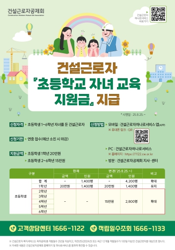 건설근로자공제회(이사장 김상인)는 침체된 건설경기를 고려한 건설근로자 추가 지원 대책으로 초등학교 2~6학년 자녀가 있는 건설근로자 2,800명에게 자녀 1명당 15만원의 교육비를 지원한다고 25일 밝혔다. 총 지원 규모는 4억 2천만 원이며, 선착순 마감이다.