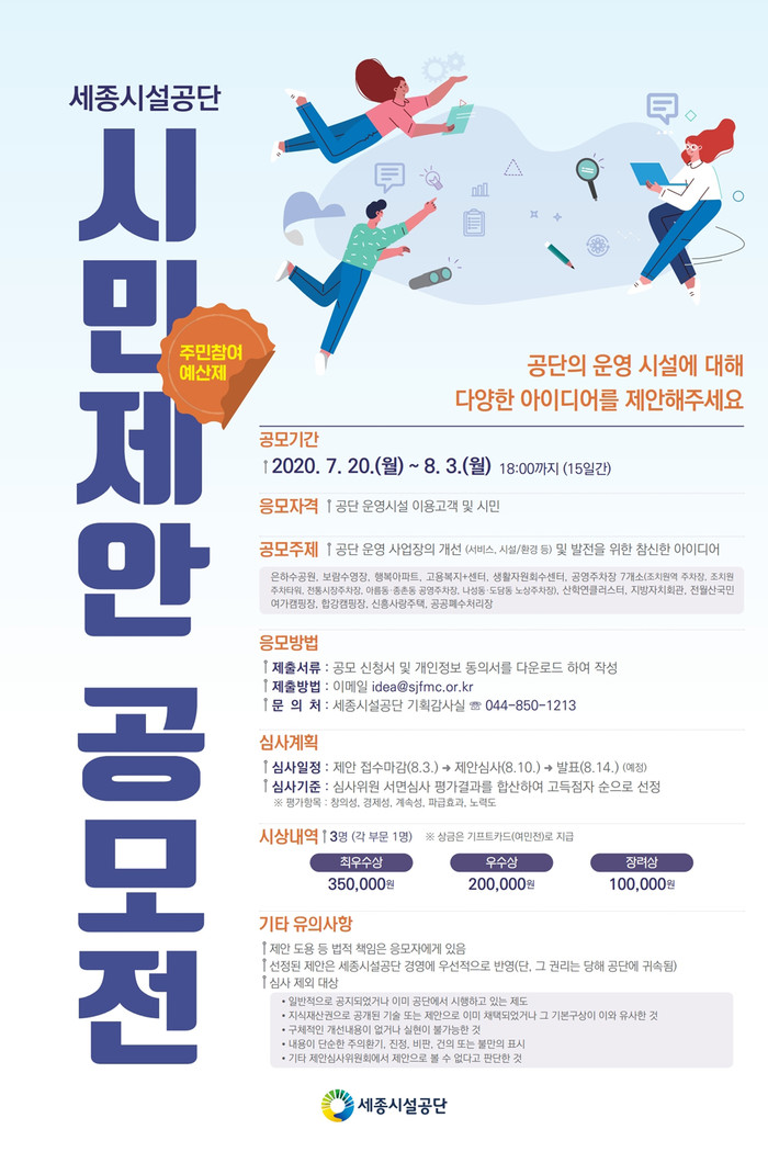 세종시시설관리공단(이사장 계용준)은 공단 운영시설의 개선 및 발전을 위해 ‘2020년 시민제안(주민참여 예산제) 공모전’을 개최한다고 20일 밝혔다.