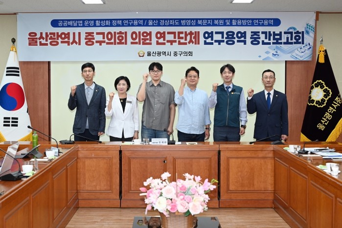 울산 중구의회는 11일 의원회의실에서 공공배달앱 운영활성화 정책연구와 병영성 북문지 복원 연구 등 2개 연구단체 용역중간보고회를 가졌다.