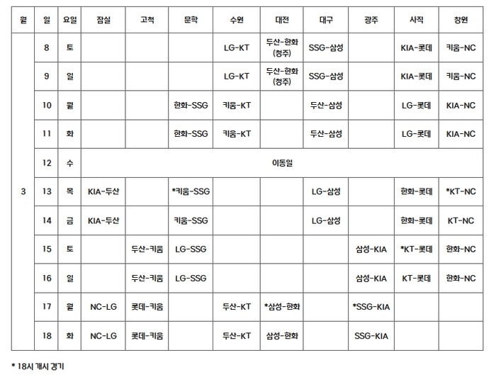 2025 KBO 리그의 시작을 알리는 KBO 시범경기가 3월 8일(토) 오후 1시 수원(LG-KT), 청주(두산-한화), 대구(SSG-삼성), 사직(KIA-롯데), 창원(키움-NC) 5개 구장에서 막을 올린다. 8일 개막을 시작으로 18일(수)까지 구단 당 10경기씩 총 50경기가 펼쳐진다.