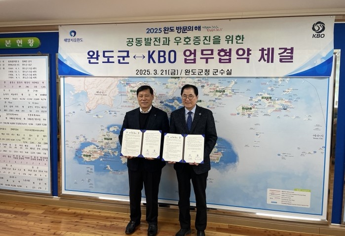 KBO(총재 허구연)와 완도군은 3월 21일 국내 프로, 아마추어 야구팀들의 동계전지훈련 및 대회, 야구관련 행사 등 야구 발전과 지역경제활성화를 위한 ‘남해안벨트 MOU’를 체결했다.