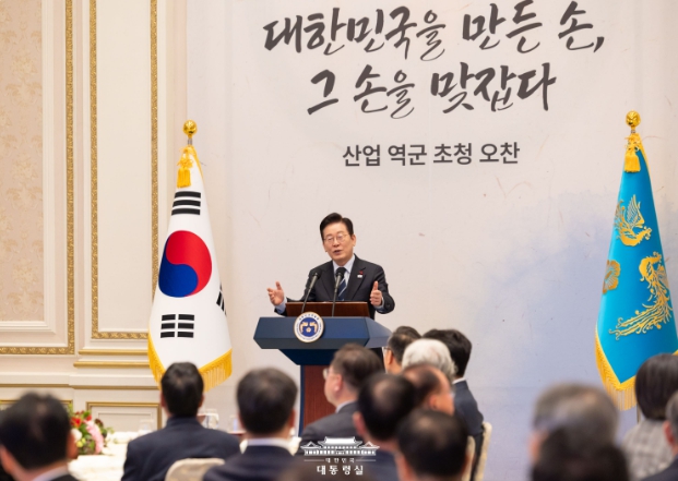이재명 대통령은 오늘 오후 청와대 영빈관에서 우리나라의 산업을 일궈온 산업 역군 90여 명을 초청한 오찬 행사를 주최했다.