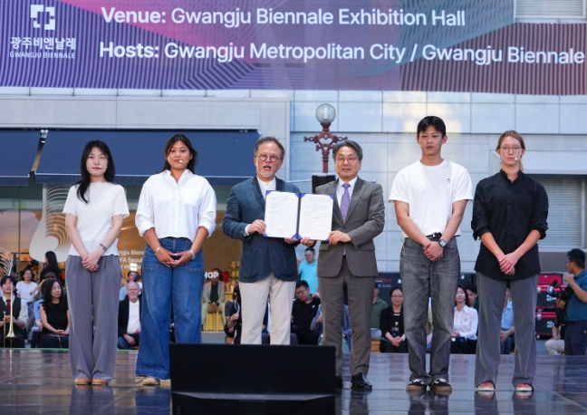 강기정 광주광역시장이 29일 오후 북구 광주비엔날레 광장 특설무대에서 열린 '2025 광주디자인비엔날레' 개막식에 참석해 국내·외 학생들로부터 광주포용디자인 매니페스토 선언서를 전달 받았다.