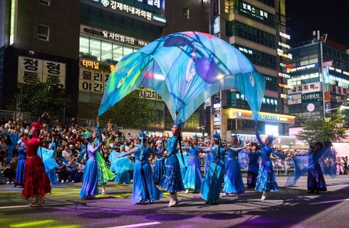 천안흥타령춤축제의 대표 프로그램인 거리퍼레이드는 오후 7시부터 방죽안오거리~신세계백화점 천안아산점 일대 550m 구간 9차선 도로에서 펼쳐졌다.