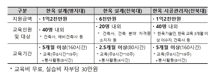 한옥 건축 전문가 양성 지정기관인 명지대와 전북대는 5월부터 매주 토요일(현업 종사자를 위해 주말 수업)에 교육과정을 운영한