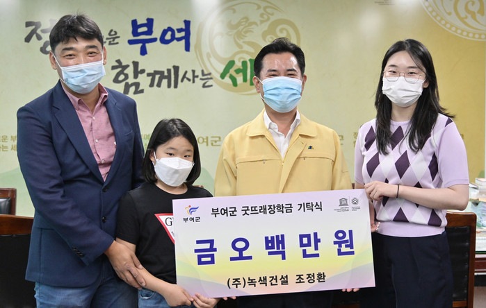 (주)녹색건설 조정환 대표는 1일 부여군청을 방문해 지역 인재 육성을 위한 장학금 500만원을 (재)부여군굿뜨래장학회에 기탁했다.