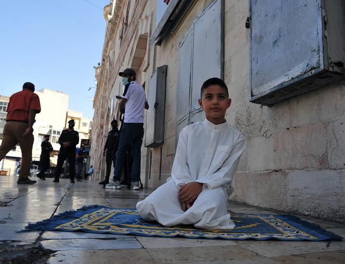 (프레스뉴스)채정병 특파원=23일(현지시간) 요르단 일일 코로나19 확진자가 3천명을 육박하는 등 진정세를 보이지 않자 요르단 정부는 올 연말까지 매주 금요일 24시간 전국 봉쇄령을 발표하고 제한적 모스크 기도회를 허용한 가운데 한 무슬림 소년이 모스크 앞에 앉아 기도 준비를 하고 있다.