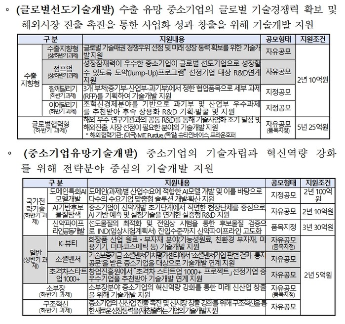 우선 ‘수출지향형’ 사업은 글로벌 시장 경쟁력 확보를 위해 기업당 최대 2년간 10억원을 지원한다. 특히 올해부터는 기존 124개 전략품목으로 제한했던 기술 분야를 전격 폐지해 중소기업이 자율적으로 혁신적인 과제를 제안할 수 있도록 했다. 다만 12대 국가전략기술이나 탄소중립 분야 등 전략기술 과제에 대해서는 평가 시 우대하여 정책적 일관성을 유지할 방침이다.