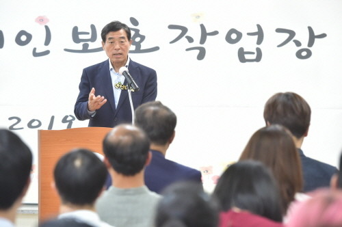 윤화섭 안산시장은 10일 단원구 원포공로1로 70, 4층에 위치한 안산내일장애인보호작업장 개소식에 참석해 축사를 하고 있다. 안산내일장애인보호작업장은 친환경 방역 및 소독 사업, 친환경 문구류 포장 사업 등을 통해 장애인을 고용해 소독 전문가로서의 역할을 하도록 자격증 취득, 방역안전교육, 소독장비 실습 등 맞춤형 프로그램을 진행한다.