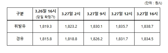 | ▲ 3.26일 ~ 3.27일 전국 주유소 평균 판매가격 추이 |