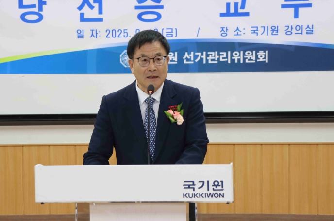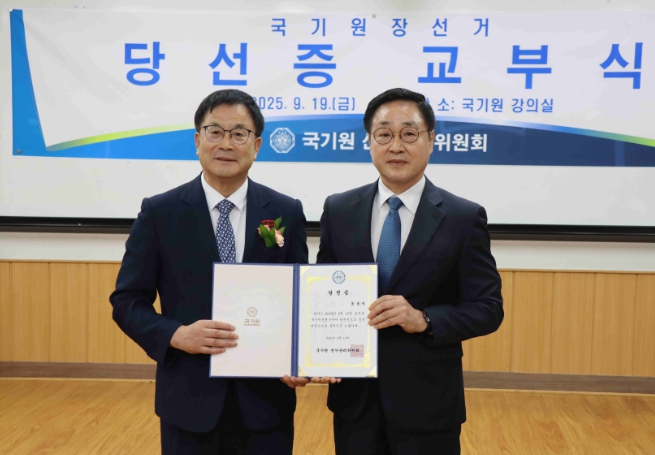 ▲ 국기원 선거관리위원회 위원장(오른쪽)으로부터 윤 당선인이 당선증을 전달받았다. |