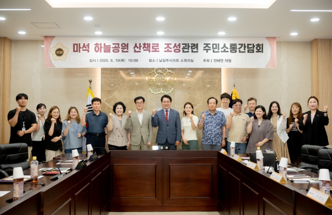 남양주시의회는 19일 시의회 소회의실에서 ‘마석 하늘공원 산책로 조성’에 따른 주민 의견수렴을 위한 소통 간담회를 개최했다.