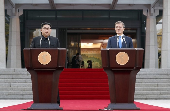 | 지난 4월 27일 남북 정상회담 후 판문점 선언을 발표하는 문재인 대통령과 김정은 국무위원장. <사진=한국 공동 사진기자단 제공> |