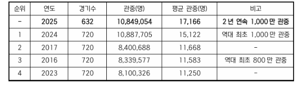 KBO 리그가 단일 시즌 역대 최다 관중 신기록 수립을 눈앞에 두고 있다.9월 4일(목)까지 KBO 리그는 632경기만에 1,084만 9,054명의 관중이 야구장을 찾아 기존 단일 시즌 최다 관중 기록이었던 2024시즌의 1,088만 7,705명에 3만 8,651명을 남겨 뒀다. 출범 첫 시즌이었던 1982년 총 143만 8,768명의 관중으로 시작했던 KBO 리그는 마흔 네번째 시즌 만에 2년 연속 1,000만 관중을 넘어서는 프로스포츠 리그로 성장했다.