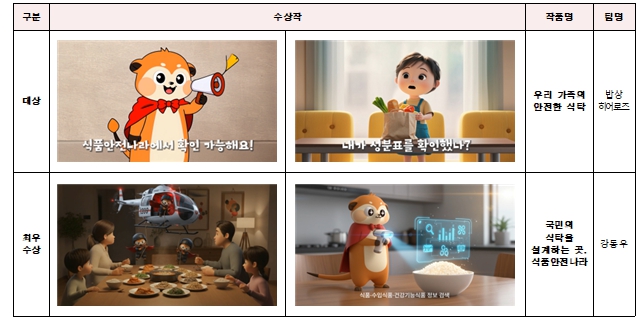 대상 수상작인 ‘밥상 히어로즈’ 팀의 ‘우리 가족의 안전한 식탁’과 최우수상 수상작인 강동우’님의 ‘국민의 식탁을 설계하는 곳, 식품안전나라’는 식품 알레르기와 같은 일상 속 식품안전에 관한 고민을 식품안전나라의 식품·수입식품·건강기능식품 정보, 우리동네 정보 및 공공데이터 활용 기능을 통해 해결하는 이야기를 담고 있다.