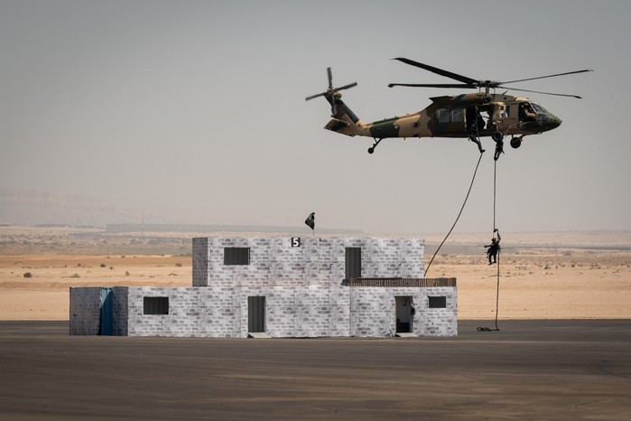 [프레스뉴스] 채정병 특파원=3일(현지시간) 요르단의 대표적 국제 방산 전시회인 2024 특수작전 장비전시회(SOFEX)가 요르단 남부 항구도시 아카바 국제전시컨벤션센터에서 73개국 300여개 방산회사가 참가해 3일간 진행되는 가운데 개막식에서 요르단 특수부대원들이 헬기레펠을 하고 있다. (사진=요르단 왕실 제공)