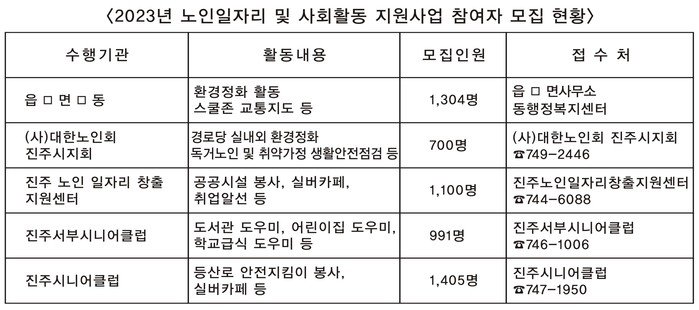 내년도 모집인원은 정부의 노인 일자리 사업 축소 발표로 올해보다 203명 감소한 5266명으로 사업이 추진될 예정이었으나, 진주시는 자체 시비를 추가 부담해 234명 증가한 5500명으로 규모를 확대해 모집한다.