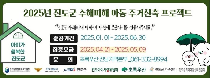 한편, 주거 지원을 위한 집중 모금 기간은 4월 21일부터 5월 9일까지이다. 모금 및 후원 관련 문의는 초록우산 전남지역본부(061-332-8994)를 통해 가능하다.